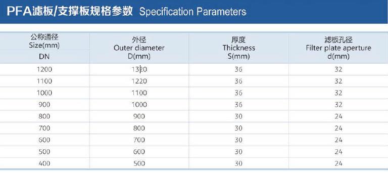 The surface of the fi lter plate contacting with the medium and its holes are made of PFA. The heated PFA particles areevenly coated and formed on the outer surface of the billet by the Teflon molding process. The product is formed at onetime without joints, and the corrosion resistance is fu lly gua ranteed by the inherent characteristics of PFA material. Atthe same time, sufficient billet th ickness is adopted to ensure its service stiffness and service life. After molding, theouter surface of the product is flat and smooth, and it is not easy to stick medium, which ensures the seal ing reliabilityand easy cleaning after assembly in the equipment. The thickness of the li ning layer is tested by the national standardhigh-voltage spark test to ensu 「e its safety and durability.